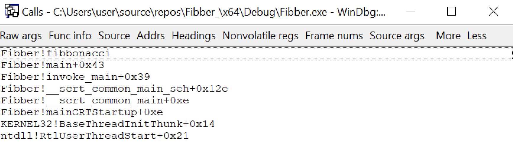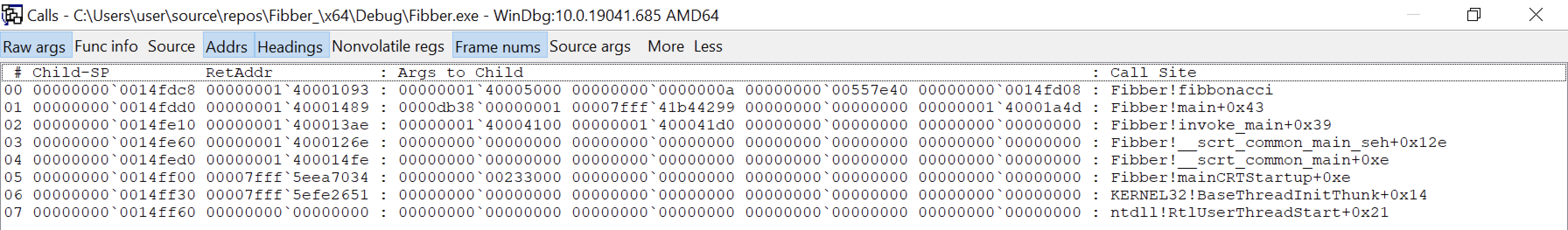 e.g. when breaking at the entrypoint of fibbonacci() in the debug build of Fibber.exe, k yields the following output.